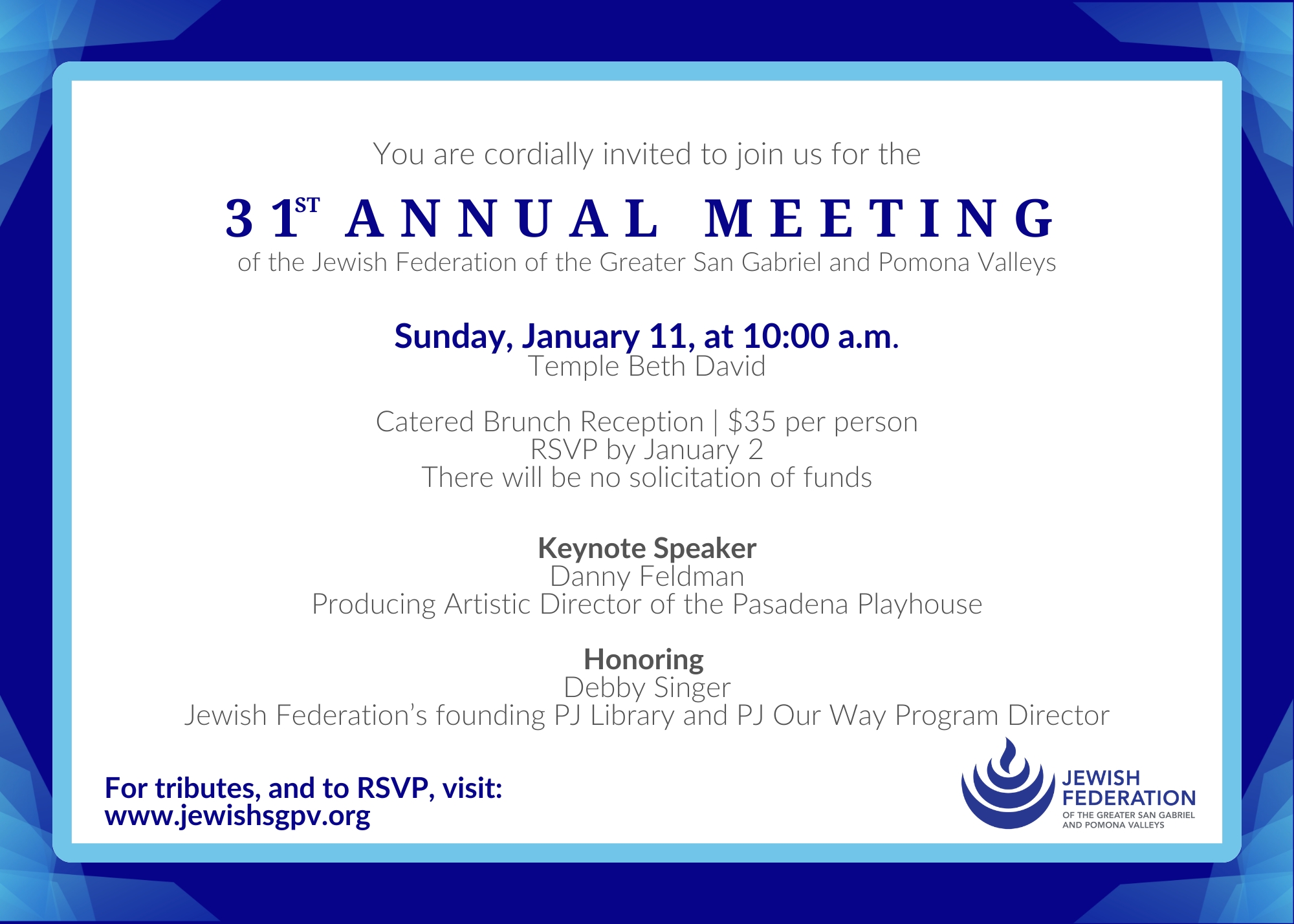 The Annual Meeting is an opportunity for the organization to provide an update to the community on the work it has been doing, how community dollars have been used to benefit and enhance Jewish life in the greater San Gabriel and Pomona Valleys, and what is planned in the coming year.