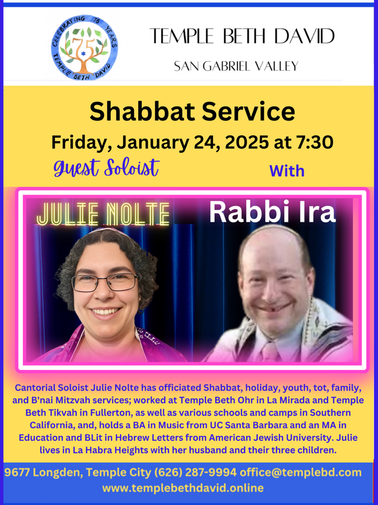 Join us for our Special Friday Shabbat Service with Guest Soloist Julie Nolte & Rabbir Ira.