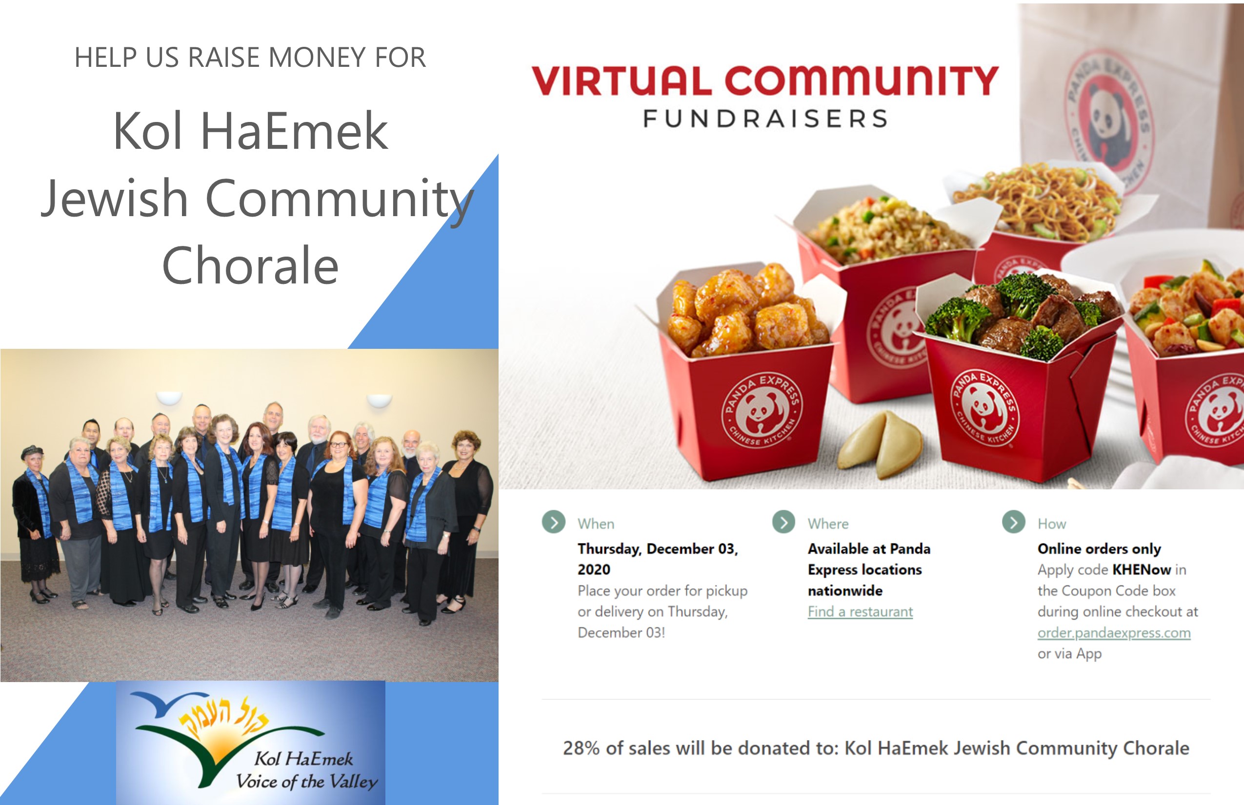 Enjoy Panda Express on Thursday, December 3rd and support Kol HaEmek Community Chorale (KHE) at the same time!