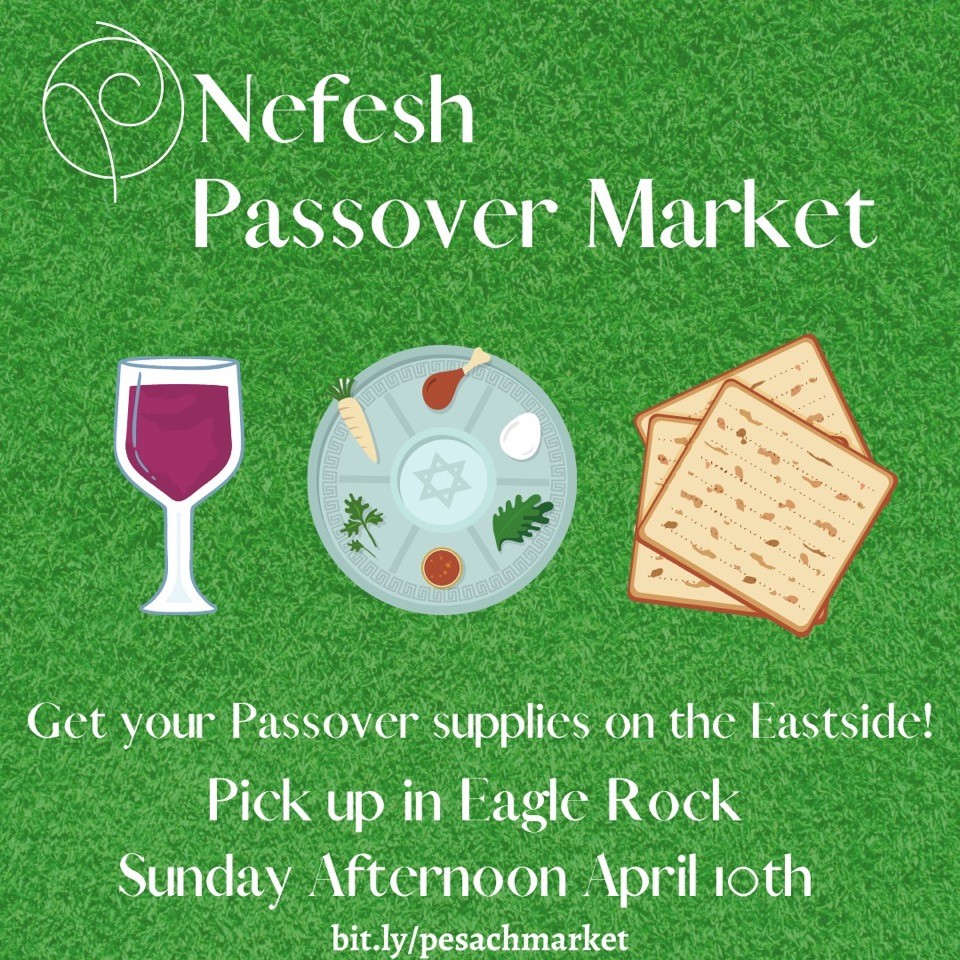 Nefesh is offering a Passover Market to the eastside communities of Los Angeles this year. Folks can order a kit of the necessities (matzah, horseradish, Kedem grape juice, parsley) and then we will have a pick up day in Eagle Rock on Sunday, April 10 from 12 - 3 pm.