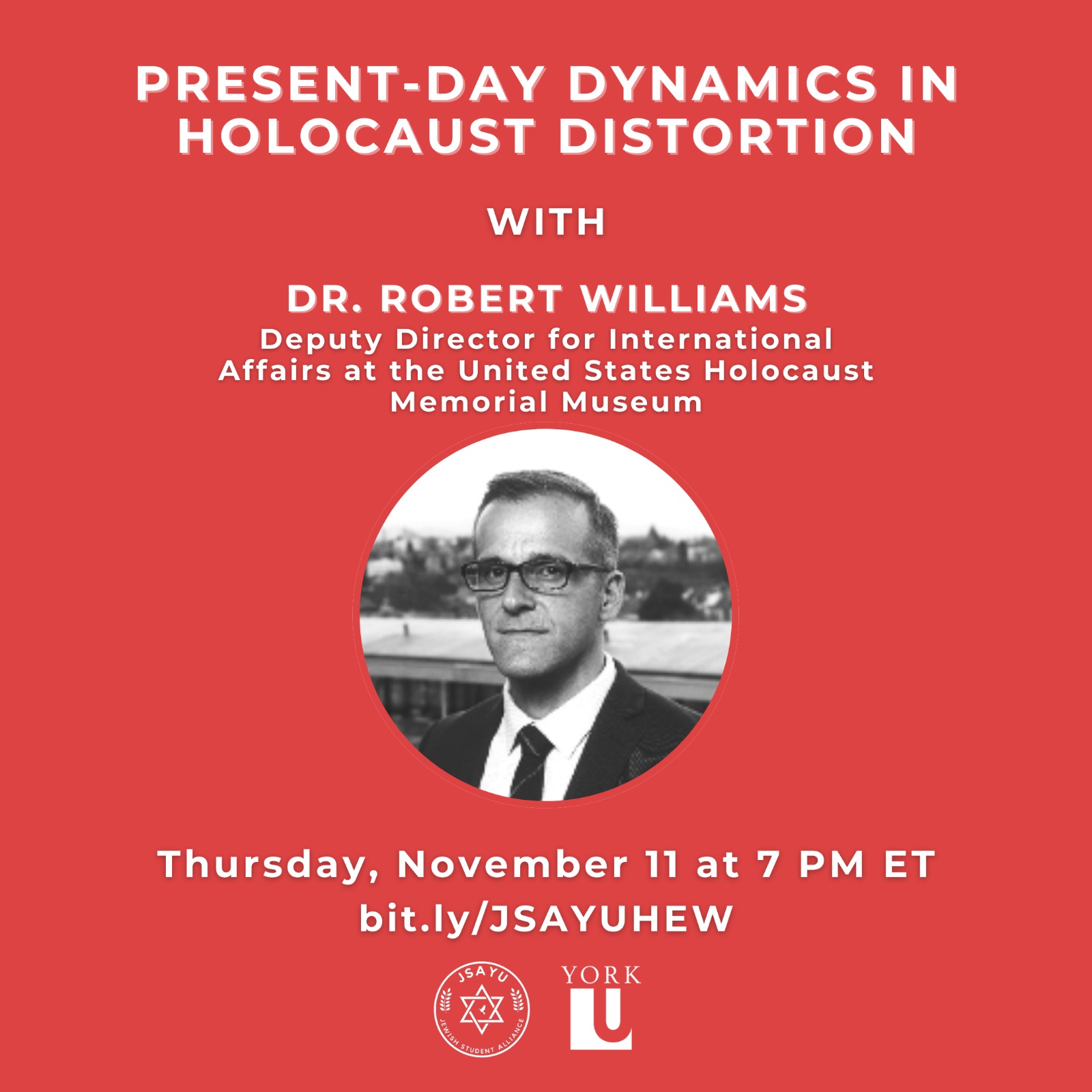 Please Join the Jewish Student Alliance, York University on Thursday November 11th at 7pm EST/ 4PM PST for a high-level discussion with Dr. Robert Williams about the present-day dynamics of Holocaust Distortion. Holocaust Distortion is a growing phenomenon. It is a pernicious form of antisemitism and paves the road for Holocaust Denial. Holocaust distortion presents in manifold insidious ways, which will be detailed in a 45 minute lecture with Dr. Williams, the Deputy Director for International Affairs at the United States Holocaust Memorial Museum and former chair of the Committee on Antisemitism and Holocaust Denial at the International Holocaust Remembrance Alliance. The lecture will be followed by 30 minutes of Q&A, so come prepared with any and all questions!