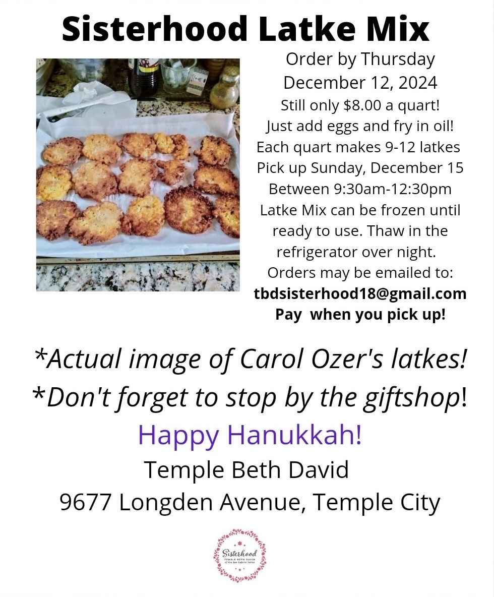 It is that time again!! Please order your Sisterhood Latke Mix by December 12, 2024.