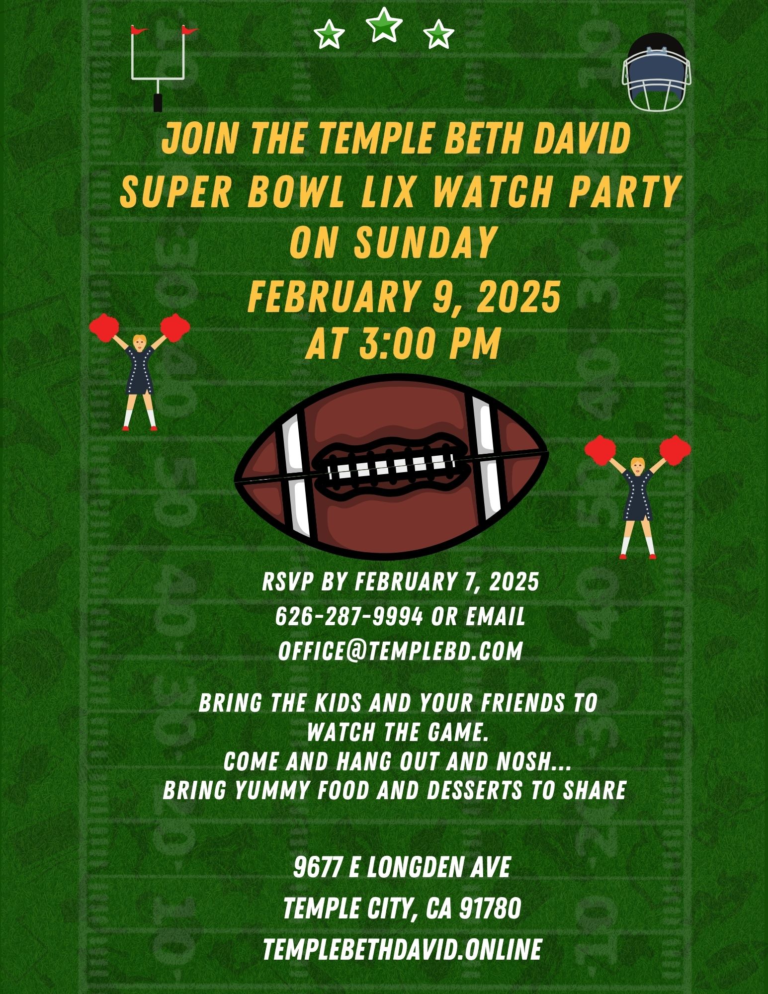 Join Temple Beth David Super Bowl LIX 2025 Watch Party on Sunday February 9, 2025 at 3:00PM.