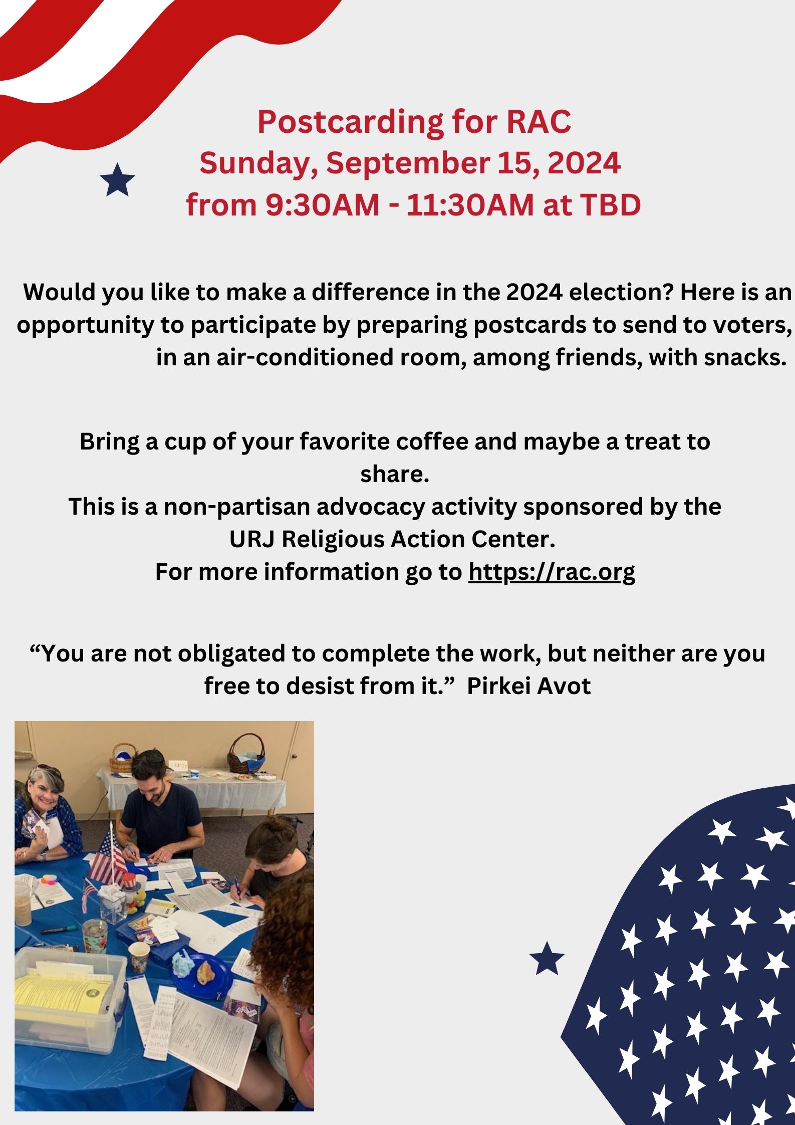 Join us on September 15, 2024 from 9:30AM-11:30PM at Temple Beth David for a Postcarding event.