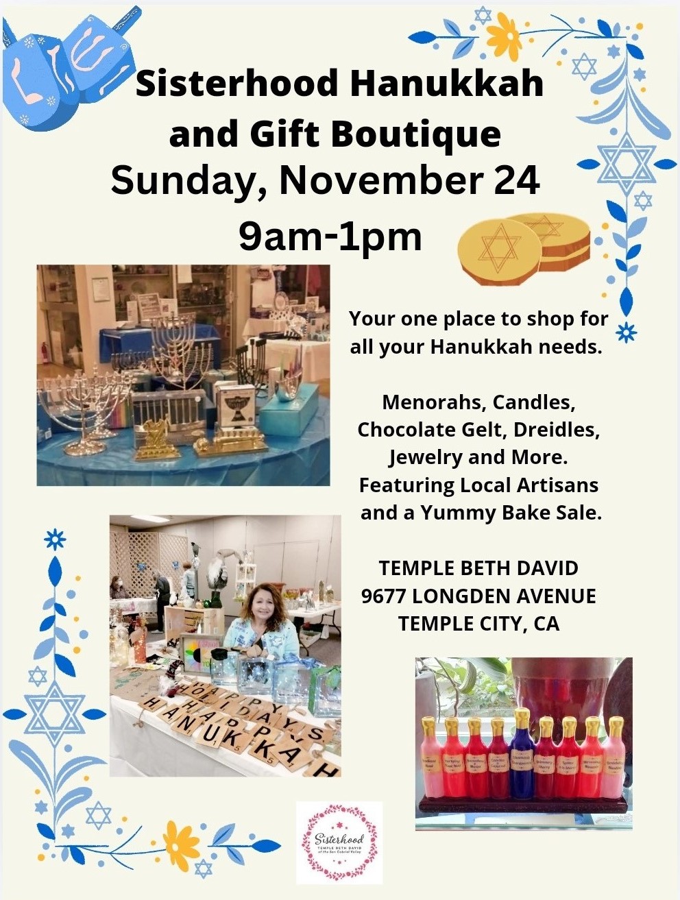 The Sisterhood Hanukkah and Gift Boutique committee is planning another fabulous fundraiser at the Temple Beth David on November 24, 2024. It will be from 9:00AM - 1:00PM with some amazing vendors showcasing their products To be purchased. This is a free event so bring your family and friends.