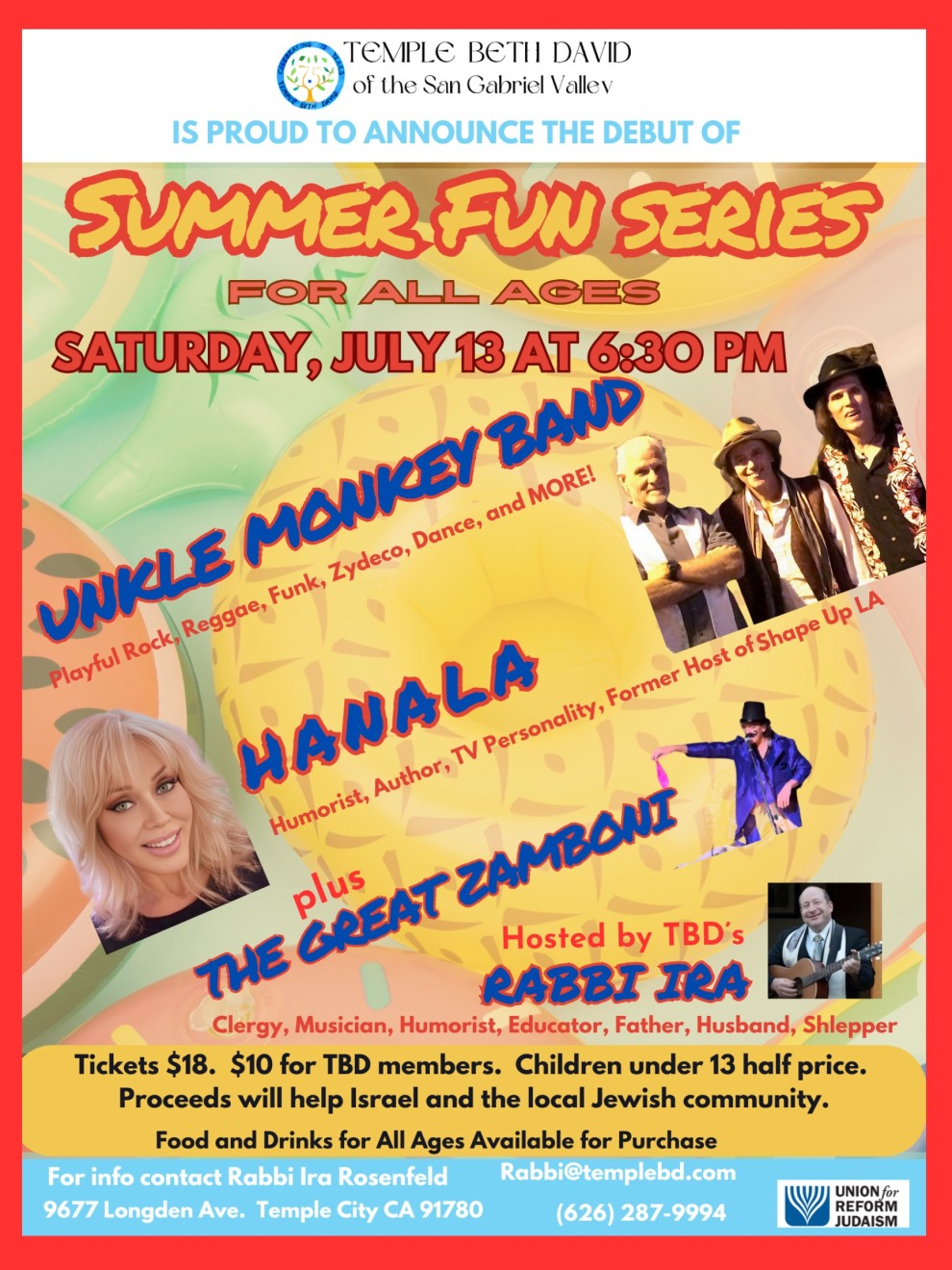 Join the 1st Annual Summer Fun Series at Temple Beth David on July 13, 2024, at 6:30 PM. This event is hosted by Rabbi Ira Rosenfeld and features great performers, a magician, and more.