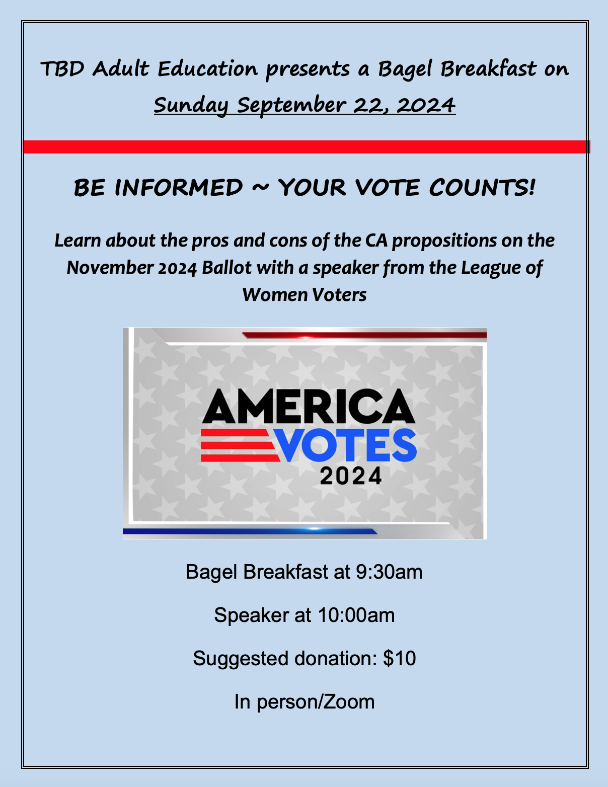 Temple Beth David of the San Gabriel Valley Adult Education presents a Bagel Breakfast on Sunday September 22, 2024. It will be from 9:30AM - 12:30PM so please stop by Be Informed ~Your Vote Counts!
