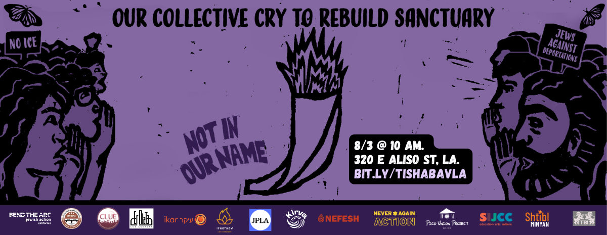 This Tisha b'Av, we mourn the destruction perpetrated on our diverse communities by the detention and deportation machine. As Jews and allies, we know that if they come for one of us, they come for us all. Alongside our immigrant neighbors, we will pray with our hearts, lips, and feet in the heart of Los Angeles, accentuating the plight of migrants and refugees while strengthening our solidarity, even as our holy city is besieged by our own government falsely in the name of our safety. Together, we will work to build collective sanctuary!