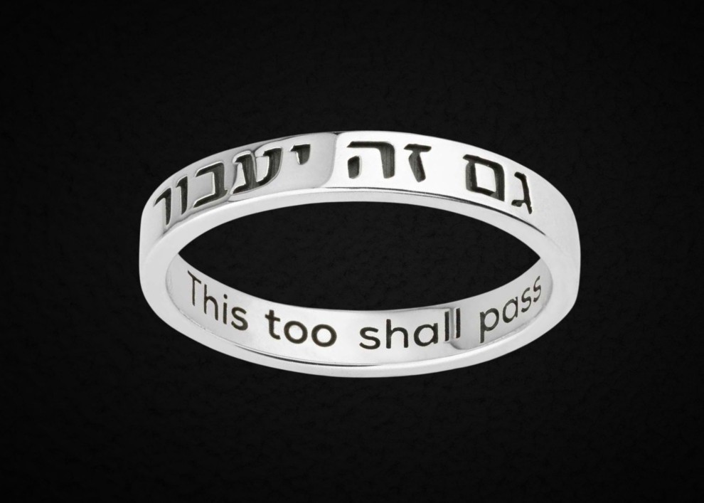 A story is told of King Solomon, who gave his most loyal servant a most challenging charge. The King asked him to find something that would make him happy when he was sad and sad when he was happy. The servant wandered from town to town for months, and just before he was about to give up, he stumbled upon a jewelry store. And as the servant told the jeweler what he had been trying to find for the King, the jeweler's face lit up and said," Ah… I have just the thing." He took a plain silver ring and engraved something on it in Hebrew. The servant took the ring and saw the words "Gam Zeh Ya'avor." (This too shall pass). All at once, he understood that a happy person looking at this ring would be reminded that their present joy would not last forever. But a sad person's heart might lift as these words brought a glimpse of better days to come. Gratefully, the servant sped home to King Solomon, knowing he had finally fulfilled his mission.
