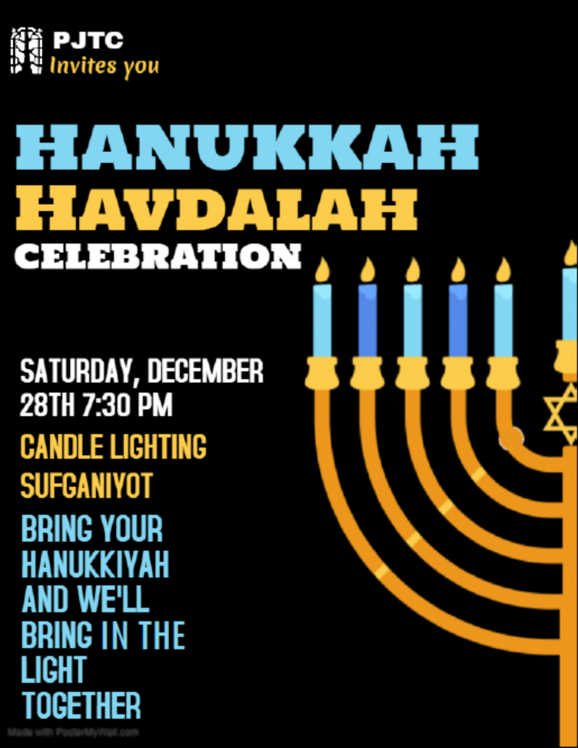 Join us for our Hanukkah Havdalah Celebration by bringing in your own Hanukkiah as we bring in the light together. Sufganiyot, music, and candle lighting!