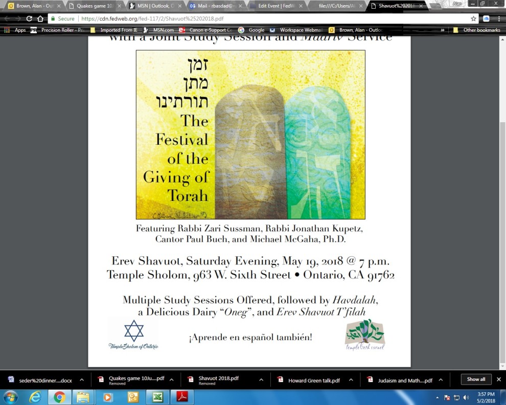 Erev Shavuot, Saturday Evening, May 19, 2018 @ 7 p.m. Temple Sholom, 963 W. Sixth Street • Ontario, CA 91762