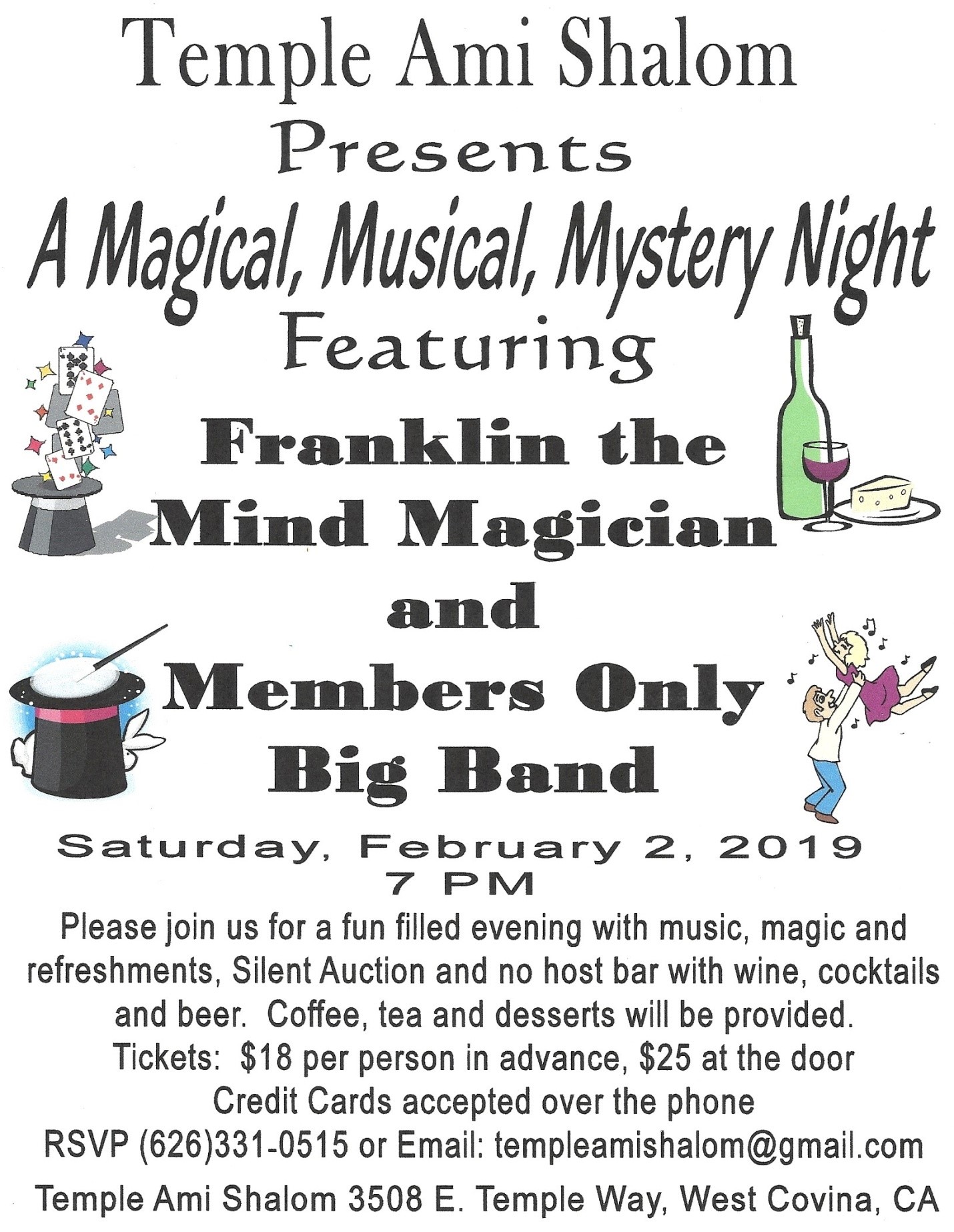 Temple Ami Shalom presents A Magical, Musical, Mystery Night featuring Franklin the Mind Magician and Members Only Big Band. Please join us for a fun filled evening with music, magic and refreshments. Silent Auction and a no host bar with wine, cocktails and beer. Cofffee, tea and desserts will be provided. Tickets: $18 per person in advance, $25 at the door. Credit cards accepted over the phone. RSVP (626) 331-0515 or e-mail: [email protected].