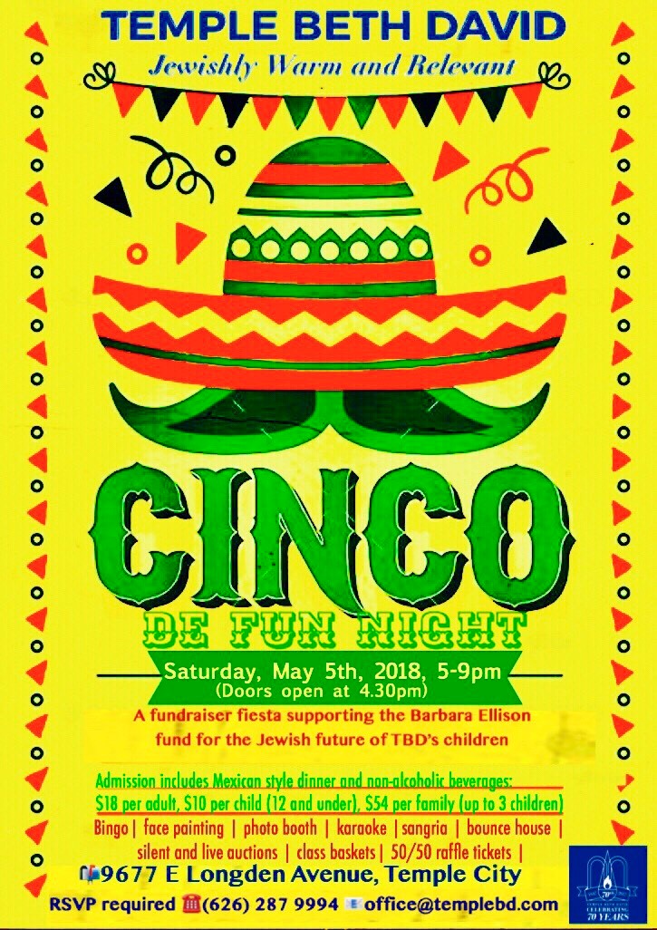 Join us for a night of bingo, silent and live auctions, sangria, karaoke, a photo booth, bounce house, and 50/50 raffle tickets! Admission includes Mexican style dinner and non-alcoholic beverages. A fundraiser fiesta supporting the Barbara Ellison Scholarship Fund for the Jewish future of TBD’s children.
