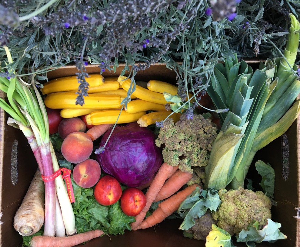 Each box costs 36 dollars and contains between 15 and 20 pounds of fresh, organic and seasonal veggies and fruits. It feeds 2-4 people per week. Questions? email [email protected]
