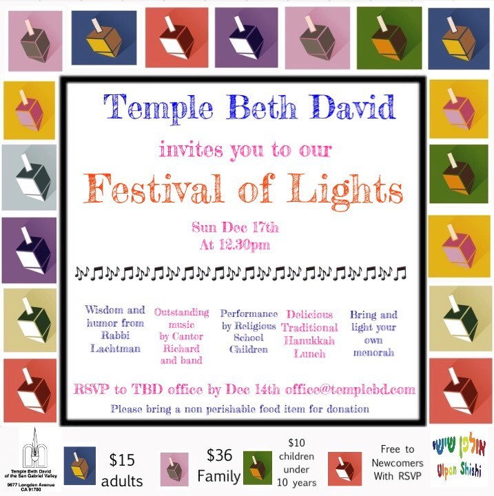 Join us for a traditional Hanukkah lunch filled with live music, laughter and celebration for all ages! Temple Beth David's Festival of Lights is Sunday, December 17 at 12:30 pm. Please RSVP by Thursday, December 14.