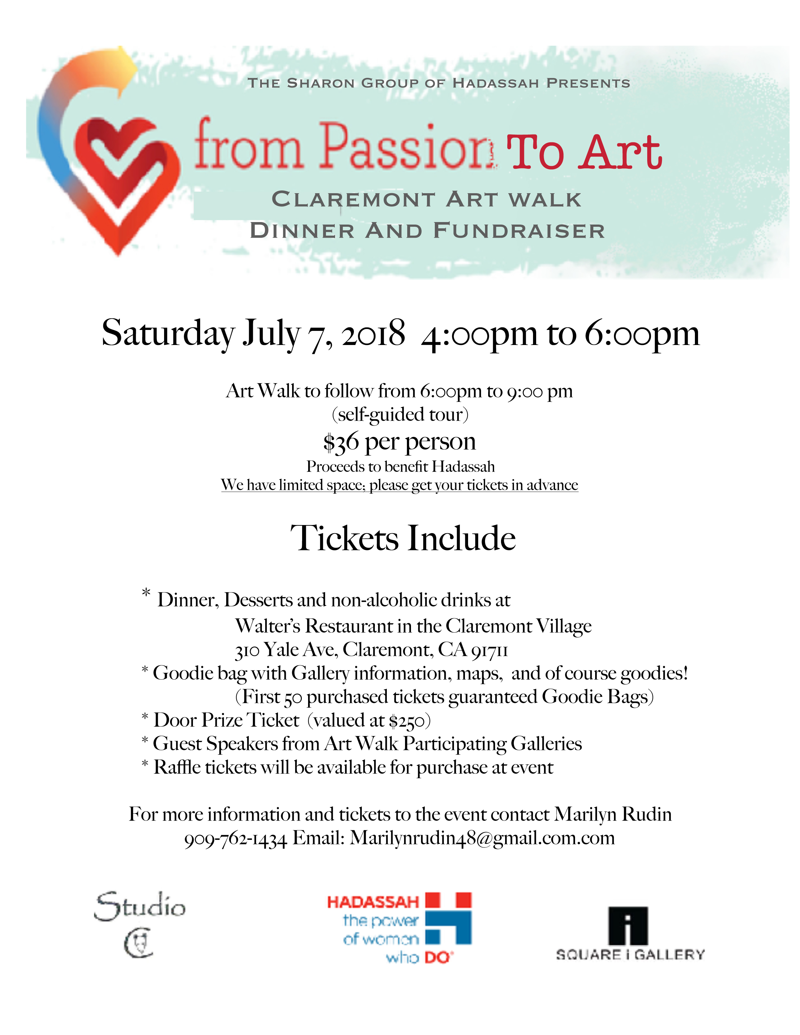 We will be having it at Walter’s restaurant in the Claremont Village. At our event we will be having local artists and gallery owners speaking about the art that will be on display in the galleries as well as the process and thoughts behind their creations. We will be serving a light dinner and desserts as well as having goodie bags valued at approximately $50.00 each and raffle prizes. After the dinner at 6:00 PM we will have a self-guided tour of approximately 12 galleries.