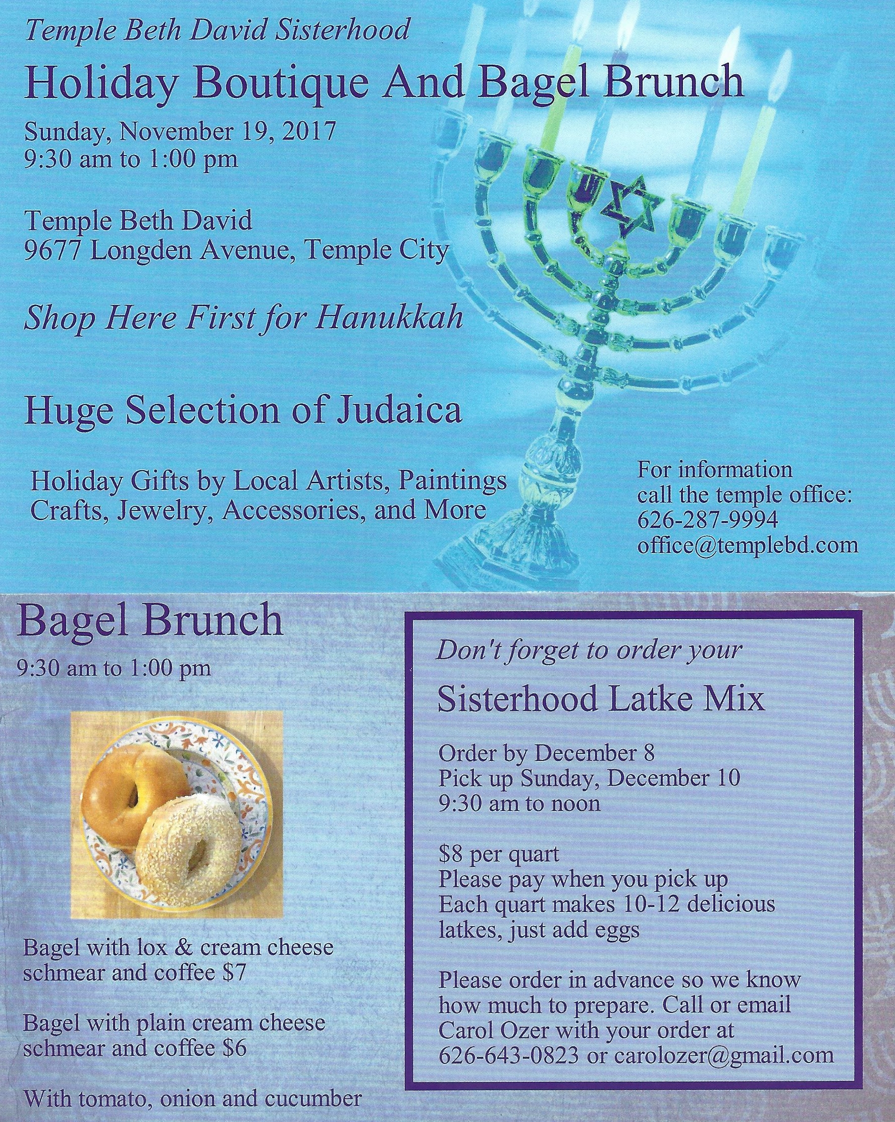 Shop here first for Hanukkah! Join us for a huge selection of Judaica- holiday gifts by local artists, paintings, crafts, jewelry, accessories and more! Need a nosh while you shop? We will be having a bagel brunch during our boutique. Hope you to see you there!