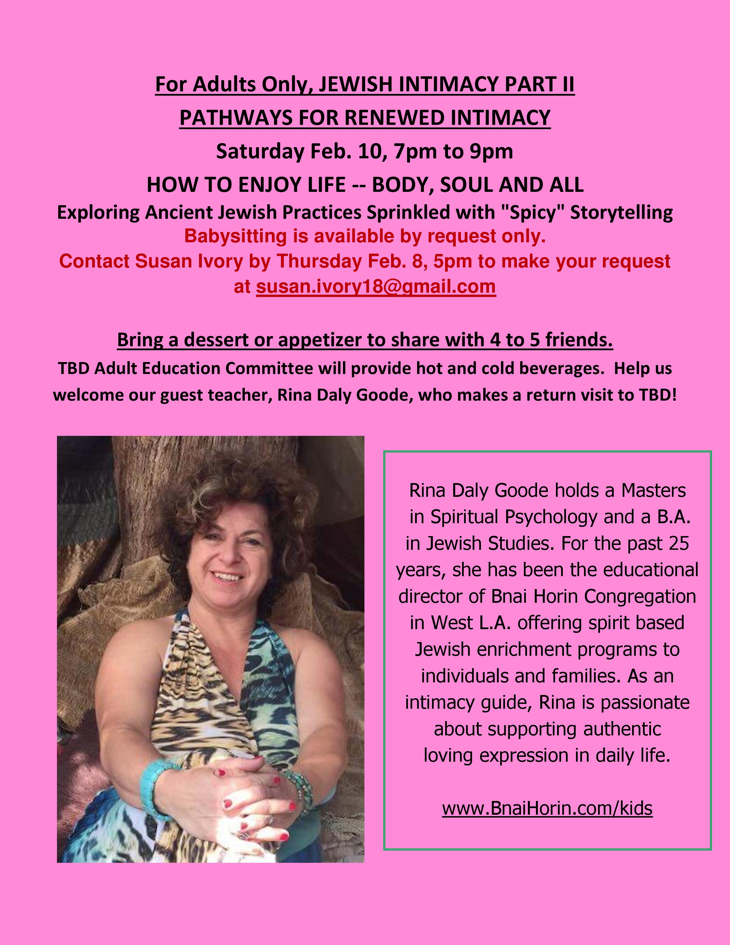 Bring a dessert or appetizer to share with 4-5 friends. Temple Beth David of the SGV Adult Education Committee will provide hot and cold beverages. Help us welcome our guest teacher, Rina Daly Goode, who makes a return visit to Temple Beth David of the SGV!