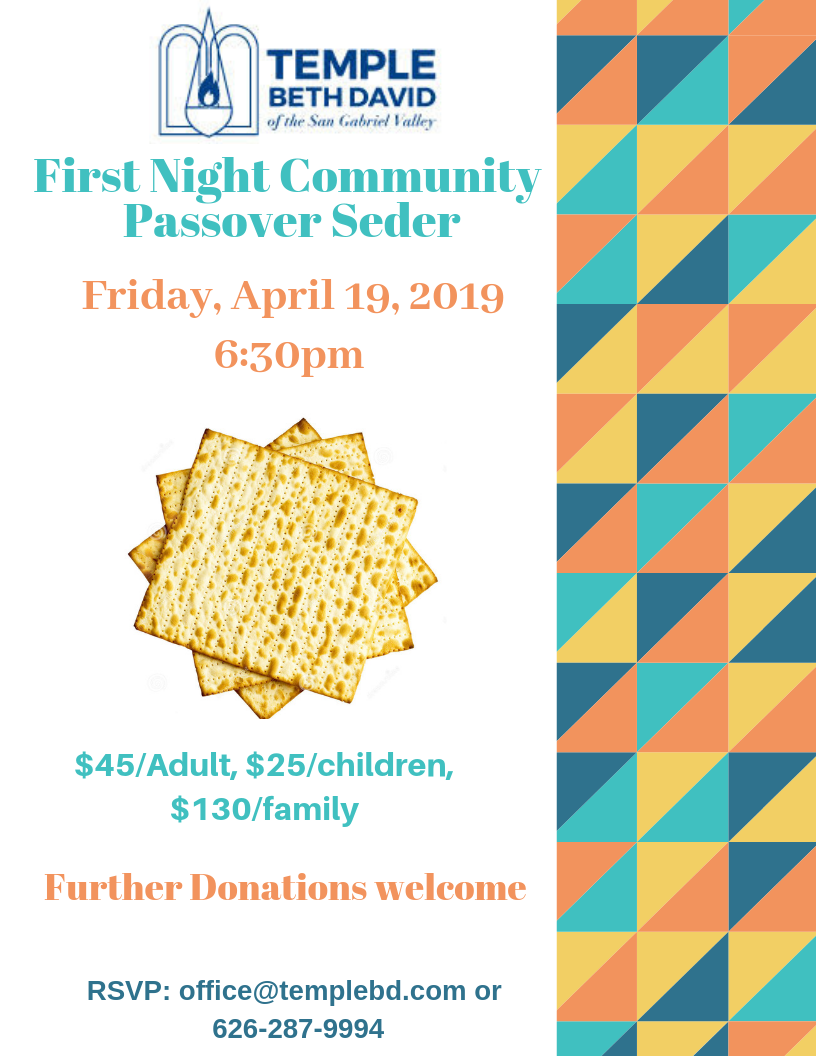Join Temple Beth David of the San Gabriel Valley for our annual Passover Seder. Please RSVP by Sunday, March 25. $45 per adult, $25 per child (12 and under) and $130 for family (up to 2 adults and 3 children 12 and under). Further donations welcome.