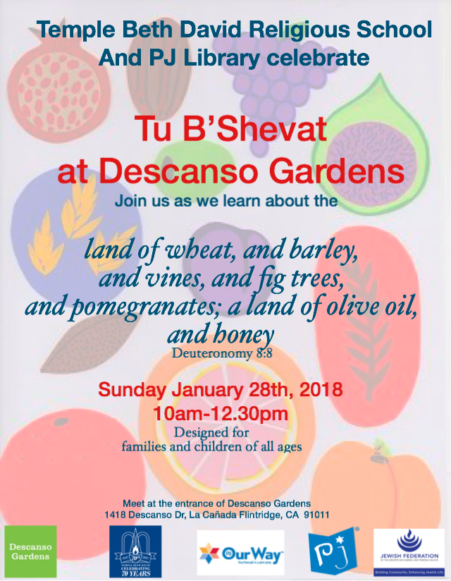 Join Temple Beth David of the San Gabriel Valley's Religious School and PJ Library as we learn about the land of wheat, and barley, and vines, and fig trees, and pomegranates; a land of olive oil and honey in an event designed for families and children of all ages. If you and your family would like to participate please contact our Educational Director Gal Kessler Rohs for more details.