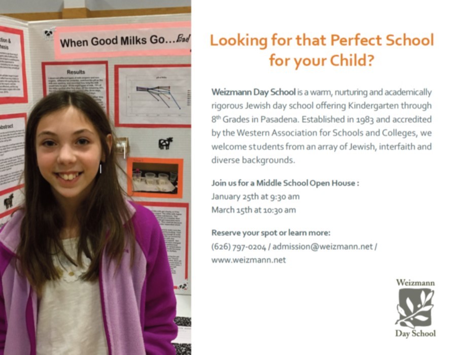 Weizmann Day School is a warm, nurturing and academically rigorous Jewish day school offering Kindergarten through 8thGrades in Pasadena. Established in 1983 and accredited by the Western Association for Schools and Colleges, we welcome students from an array of Jewish, interfaith and diverse backgrounds.