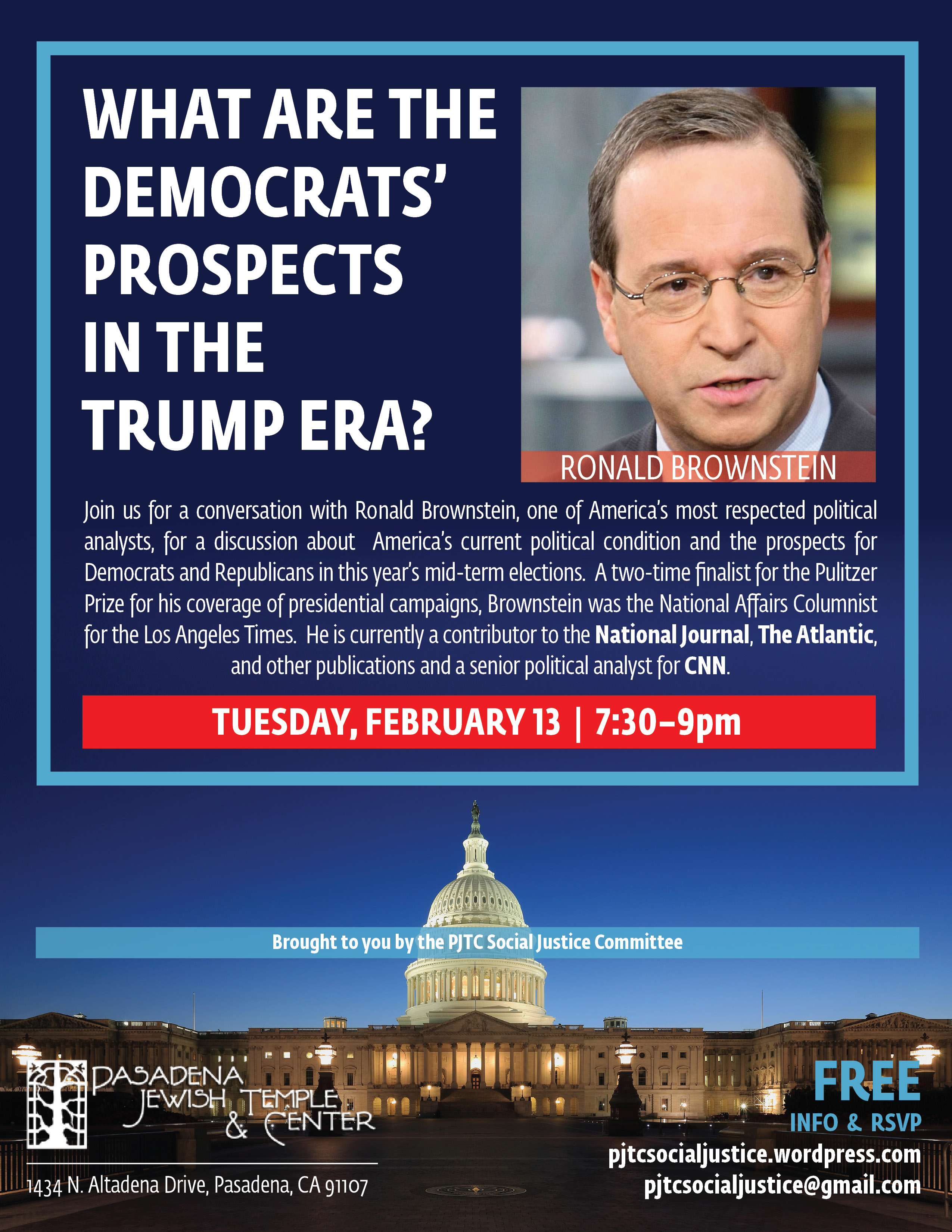 Tuesday, February 13 from 7:30 - 9:00 PM at Pasadena Jewish Temple and Center.