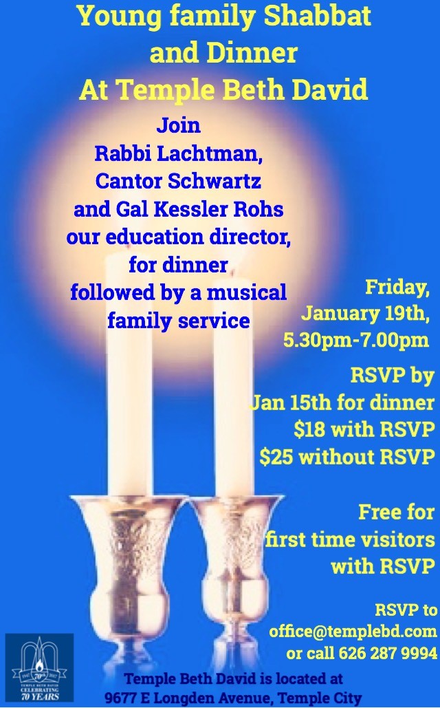 Join Rabbi Lachtman, Cantor Schwartz and Gal Kessler Rohs our educational director for dinner followed by a musical family service! For dinner, please RSVP by January 15th for $18 or $25 without RSVP per family. Free for first time visitors with RSVP. Please RSVP to [email protected] or call (626) 287-9994.